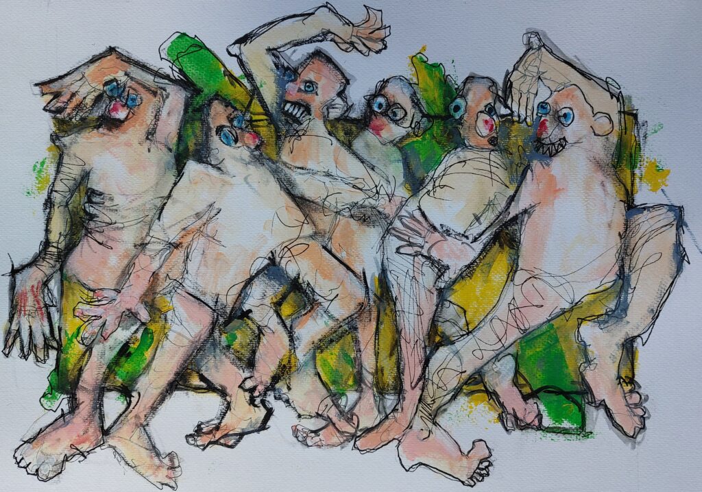 Cette œuvre de Pilip présente une composition dynamique de figures humaines stylisées, aux corps entrelacés et aux expressions intenses. Les personnages, aux teintes chair nuancées, sont définis par un trait noir gestuel et énergique, presque griffonné, qui accentue leur mouvement. Des éclats de vert vif et de jaune lumineux ponctuent l’arrière-plan, créant un contraste saisissant avec les formes organiques. Leurs visages arborent des yeux bleus perçants, des nez rouges et des bouches parfois dentelées, conférant à l’ensemble une atmosphère à la fois brute et expressive. Ce dessin vibrant capture une énergie frénétique à travers ses formes déconstruites et sa palette audacieuse.